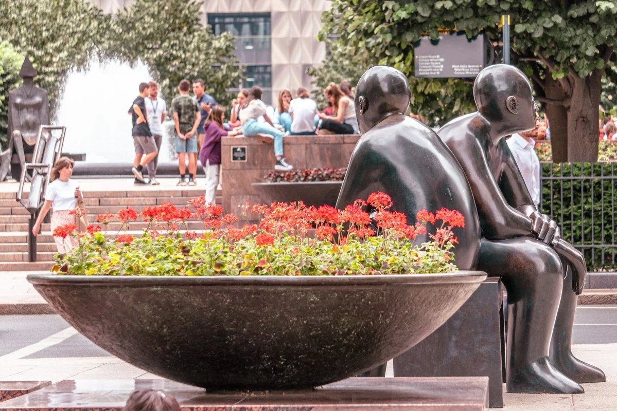 Poznali się podczas podróży i uwielbiają jeździć na rowerze, a tą ich rzeźbę możesz znaleźć niedaleko stacji metra Canary Wharf.