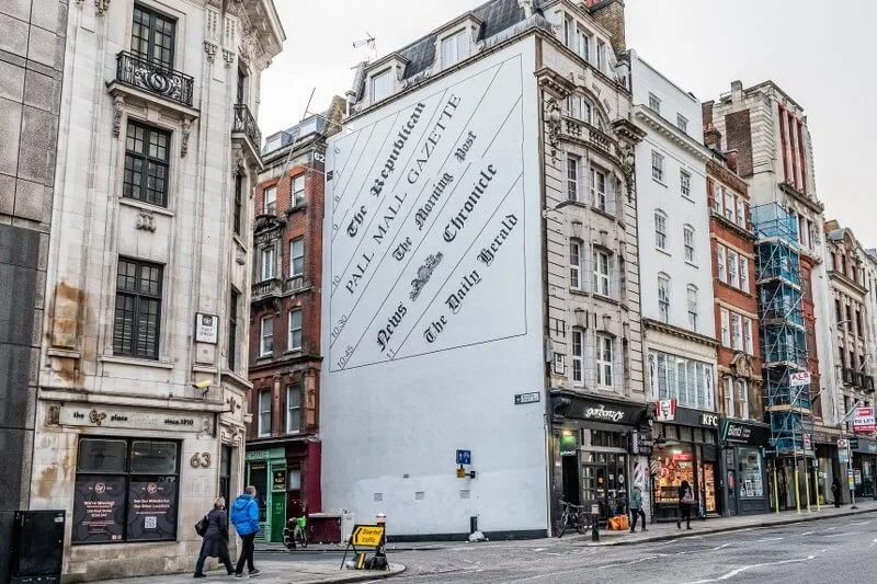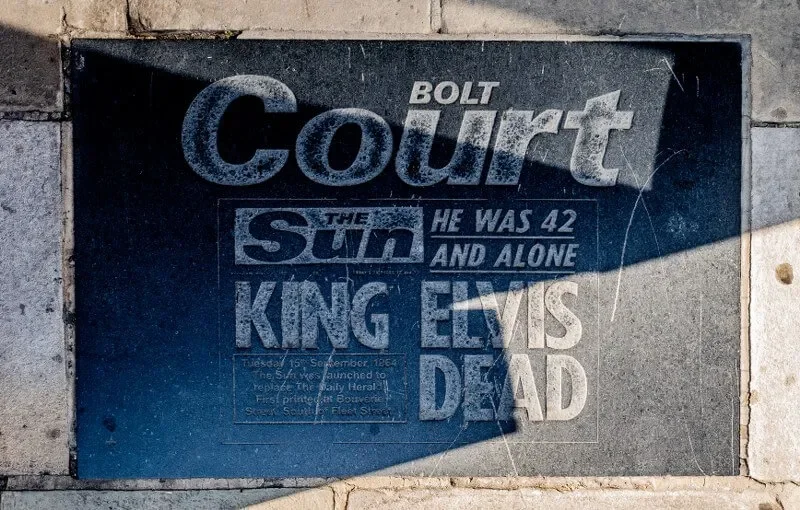 Some depict famous newspaper front pages printed in the area, such as the one at Bolt Court that shows The Sun’s front page announcing Elvis Presley’s death in 1977.