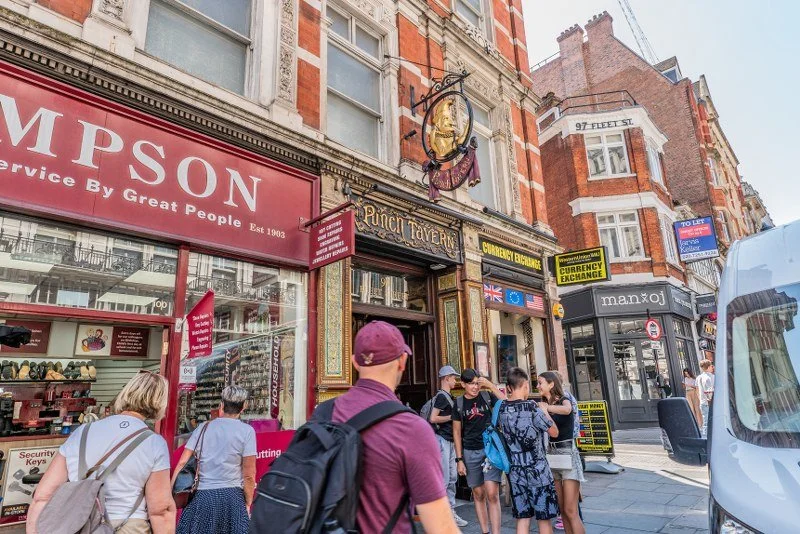 I recommend beginning this walk with a visit to The Punch Tavern, a historic pub named after the famous magazine that had its offices just around the corner.