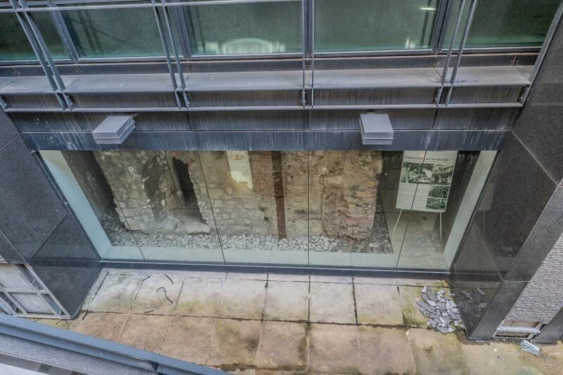 On Ashentree Court, located to the south of Fleet Street, hidden below ground level and behind a glass wall, you can find the remains of a 14th-century crypt from the religious house that existed there from the 13th to the 16th century.