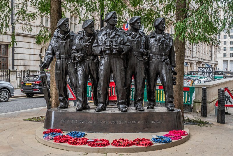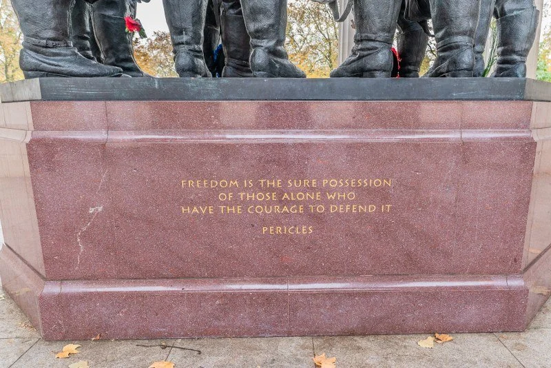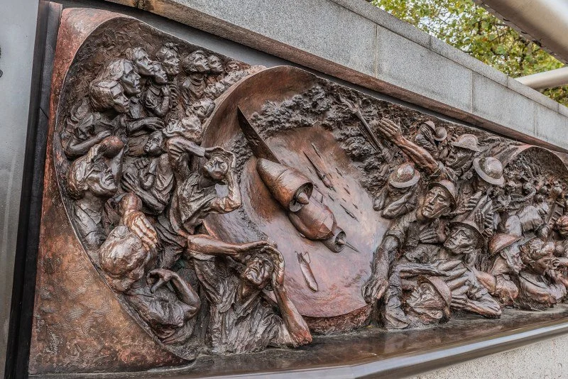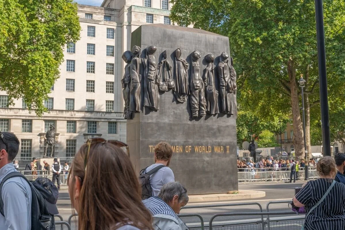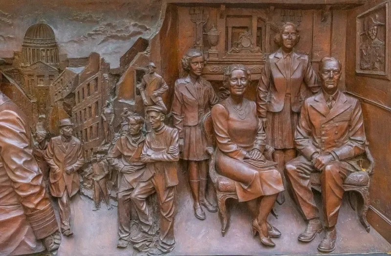 Many people may not consider this memorial strictly as a war memorial. However, it does feature important moments from the lives of parents of late Queen Elizabeth II, including scenes from WWII when they bravely remained in London during the Blitz alongside the people to suffer the consequences of German bombing.
