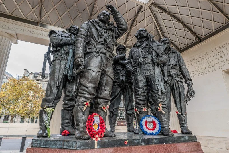 The memorial features a large bronze sculpture of seven aircrew, representing the diversity of the individuals who served in Bomber Command.