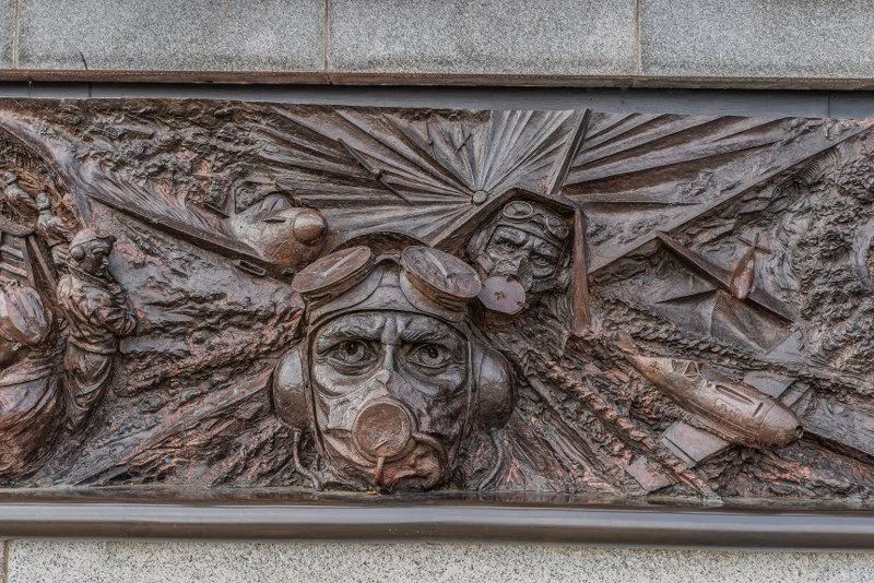 The monument features a group of bronze statues representing various scenes from this important battle, including airmen running towards their planes.