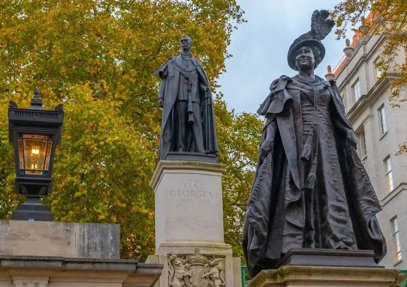 The monument shows King George VI in his naval uniform, while the Queen Mother's sculpture portrays her at the age of 51, the age at which she became a widow after her husband's passing in 1952.