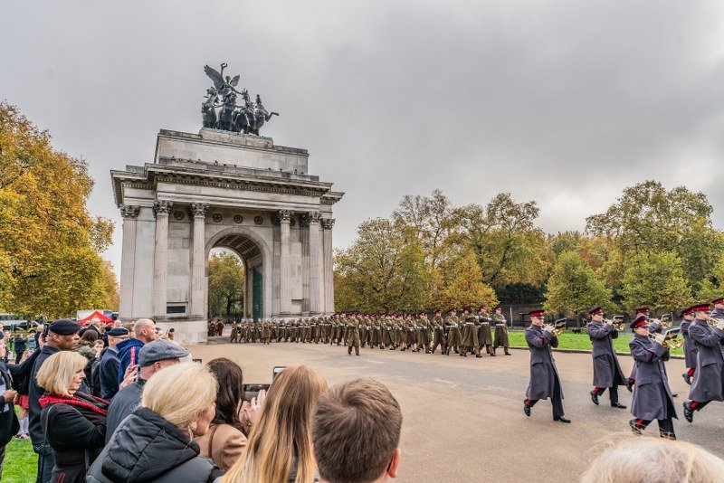 The green space surrounding the Wellington Arch, located between Hyde Park and Green Park, is one of the best places in London to witness Remembrance Day celebrations on the 11th of November.