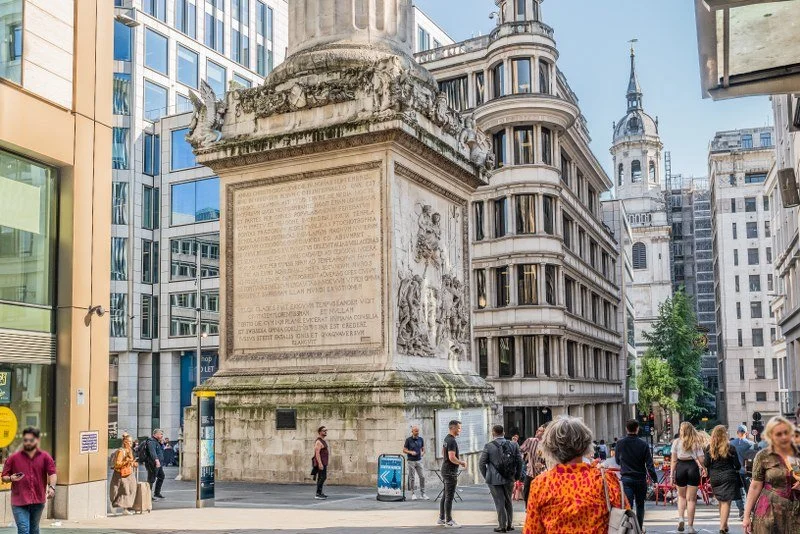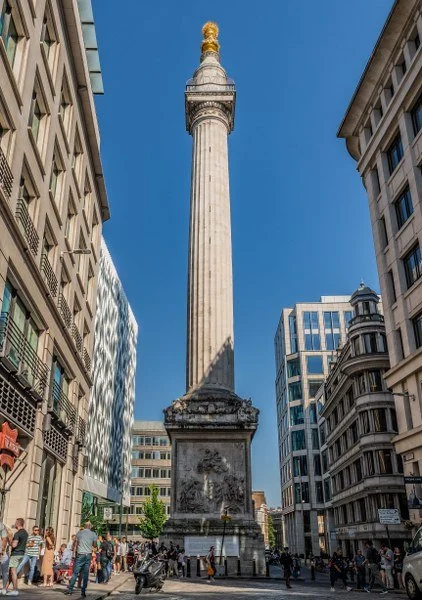 The Monument to the Great Fire of London to kolumna o wysokości 61 metrów, którą możesz znaleźć w pobliżu północnego krańca mostu London Bridge.